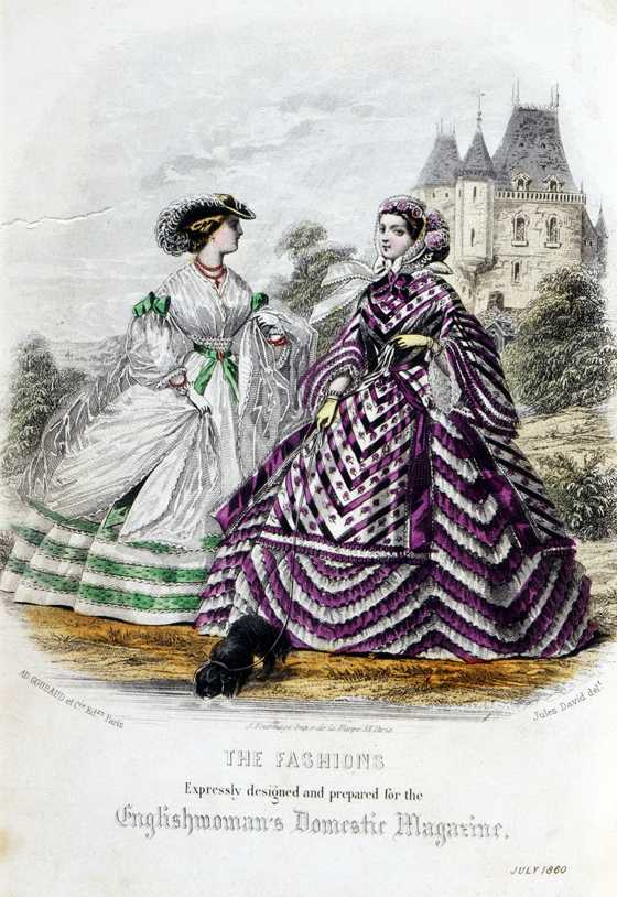 The clothing of the early 1860’s held an air of refinement and elegance. During the daytime ladies did not expose their arms or shoulders; necklines were very prim and proper. The classical silhouette was a snug bodice, full sleeves, and wide skirts which helped to emphasize a small waistline.