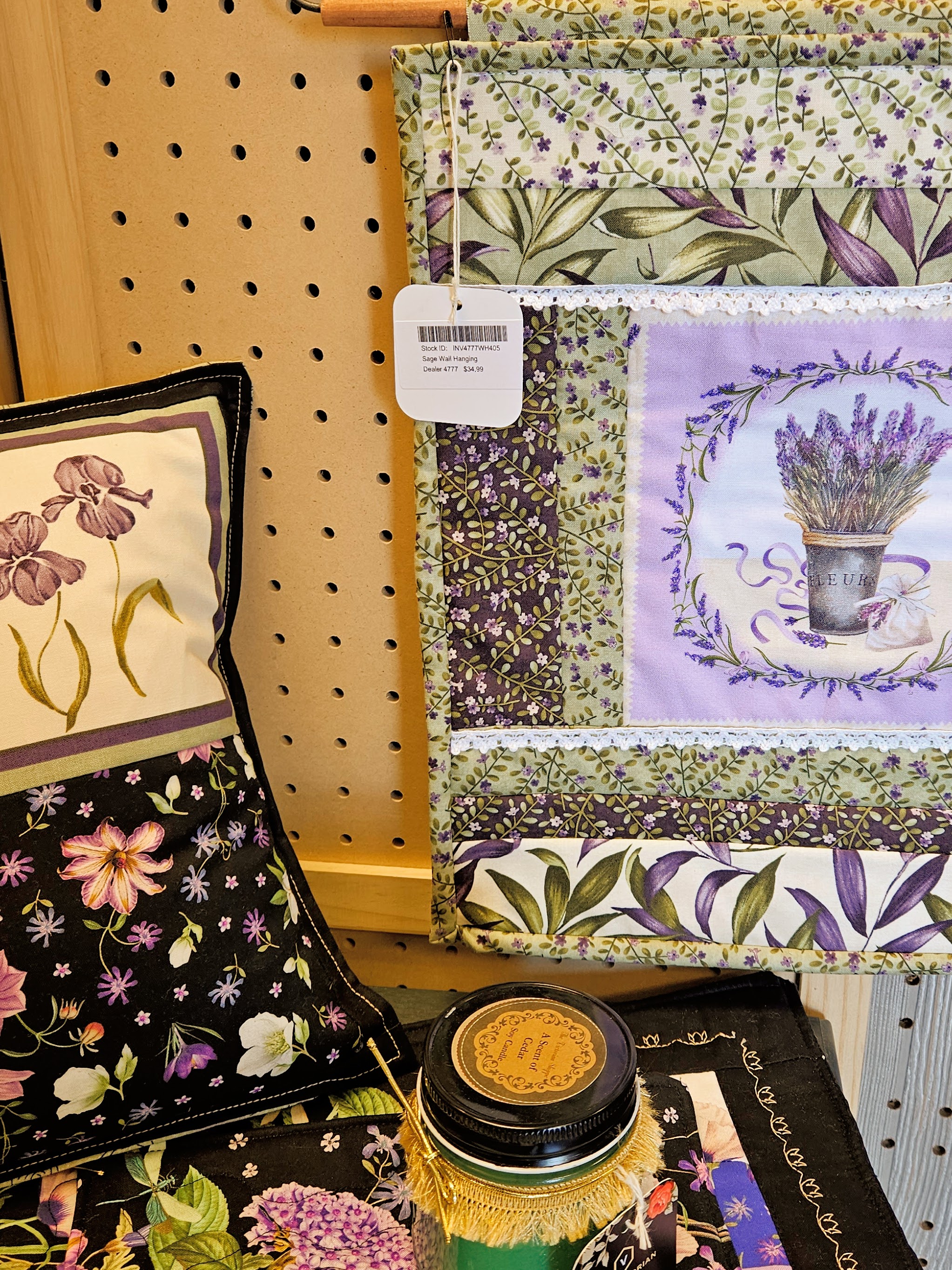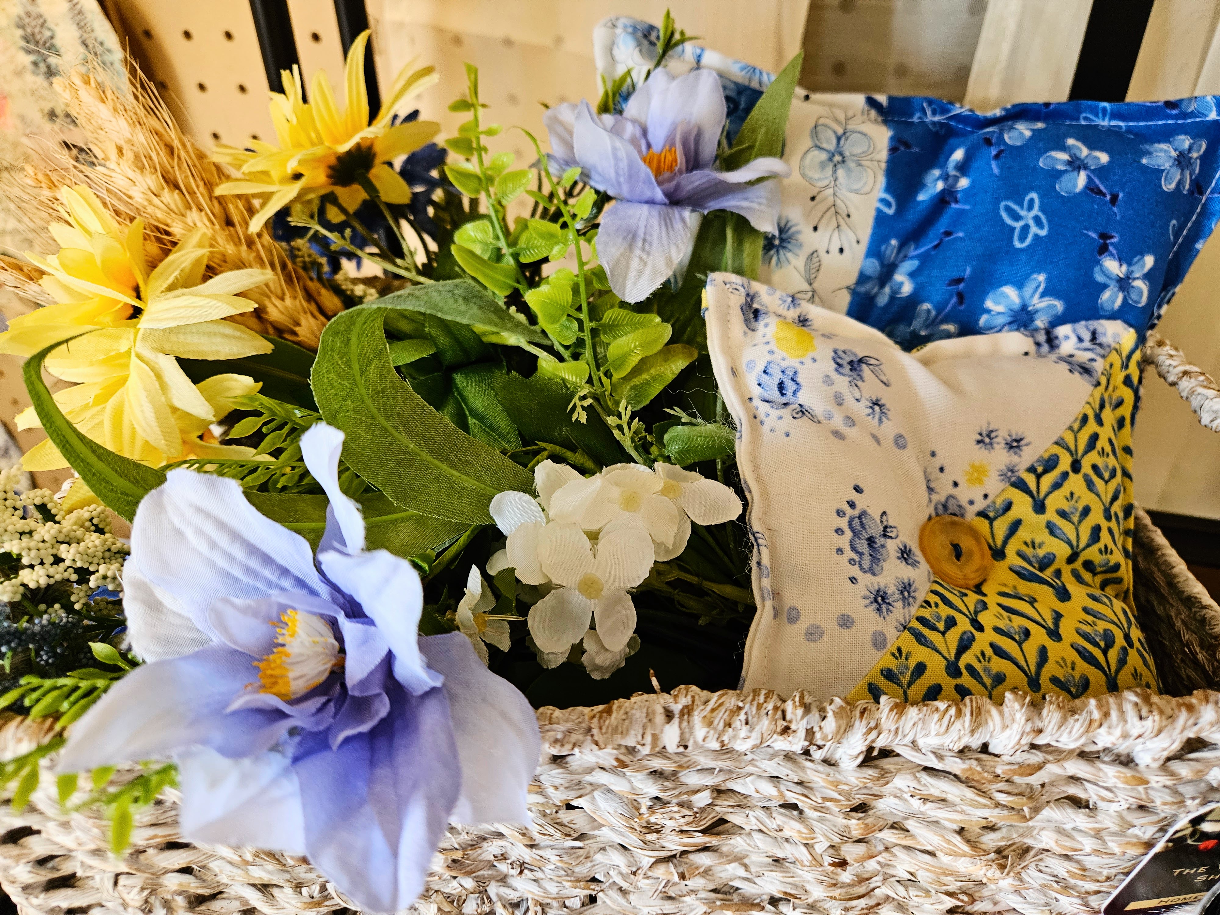 The booth is currently filled with lovely blue and sage pillows, tea towels, mug rugs, and center pieces. All items feature exclusive high quality fabric and materials. It’s been fun creating decorative pieces featuring vintage baskets, beautiful silk flowers, and designer fabric. Here is a sneak peak at the latest creations.