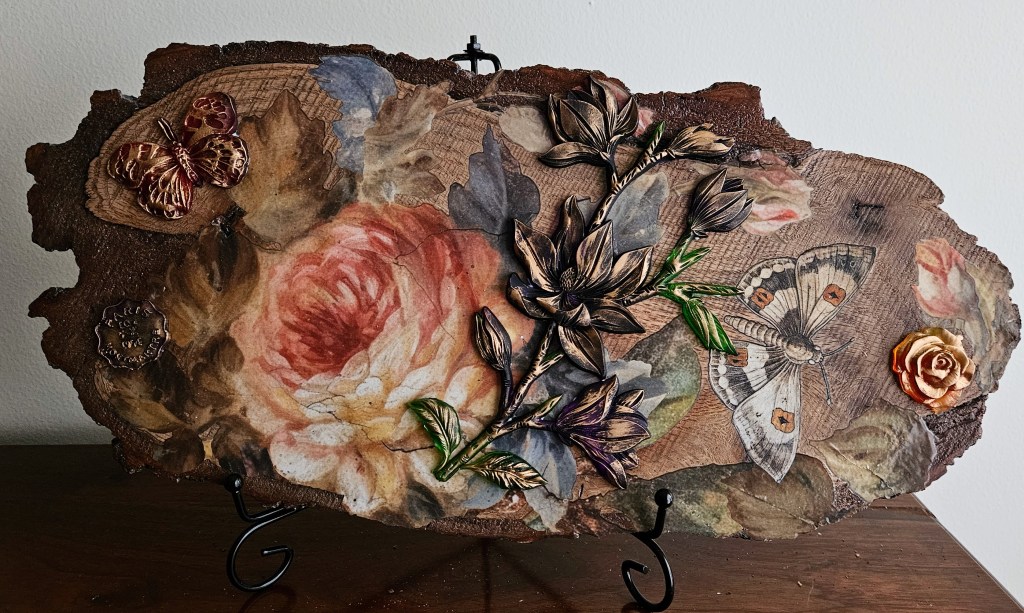 I wanted to preserve some of the texture, so I lightly sanded the wood. A couple applications of clear coat varnish brought out the natural color of the wood and prepped it for the artistic detailing using mixed media techniques.